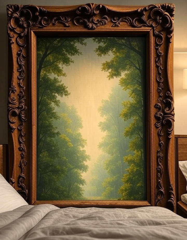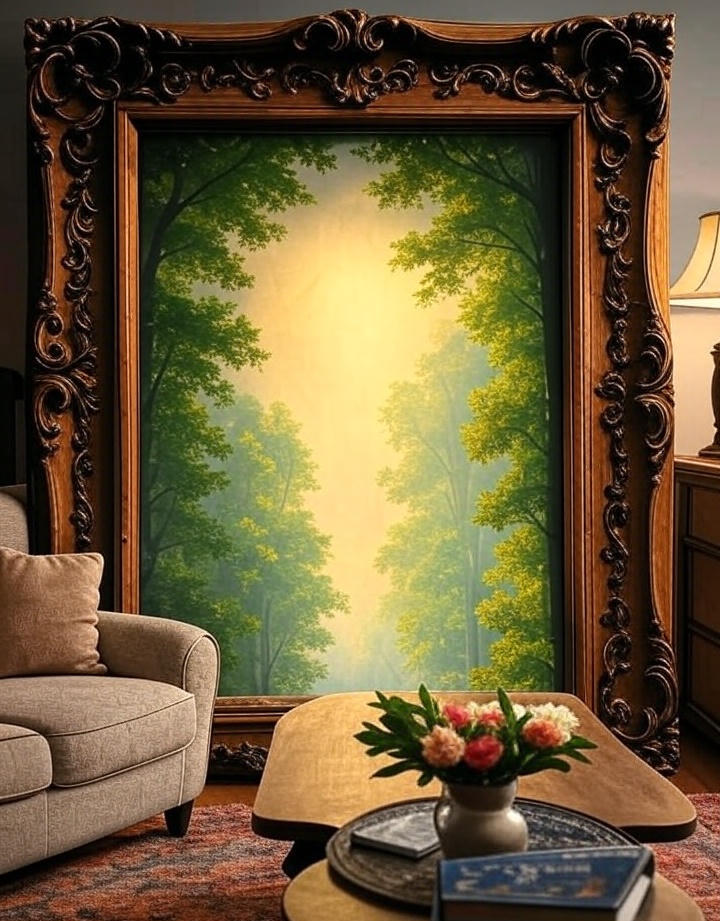 The frame displays a painting comprising a serene misty forest trail. The painting is enclosed within a frame that is dainty in shape and contains meticulous hand-carvings. The faint glowing of the horizon is truly breathtaking. The gentle and soft brown tones of the frame harmonizes well with the colors found in the forest serving as a perfect blend of craftsmanship that is stunning to look at. This sculpture would add elegance to any dull kitchen and living room and becomes a centerpiece full of warmth. The enchanting and misty hue of the painting leads to a serene place while at the same time emplaced wonder. The exquisite craftsmanship effortlessly merges nature with art. This would blend in with either contemporary or traditional settings. This would effortlessly elevate the beauty of any home and serves as a perfect calming visual for the eyes.